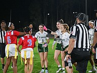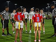 FPC and Seabreeze flag football captains meet for the coin toss at the game on Thursday, Feb. 19 at the Ormond Beach Sports Complex. Photo by Michele Meyers