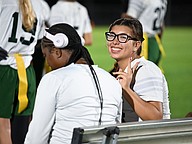 The FPC flag football photographer flashes a smile during the game against Seabreeze on Thursday, Feb. 19 at the Ormond Beach Sports Complex. Photo by Michele Meyers
