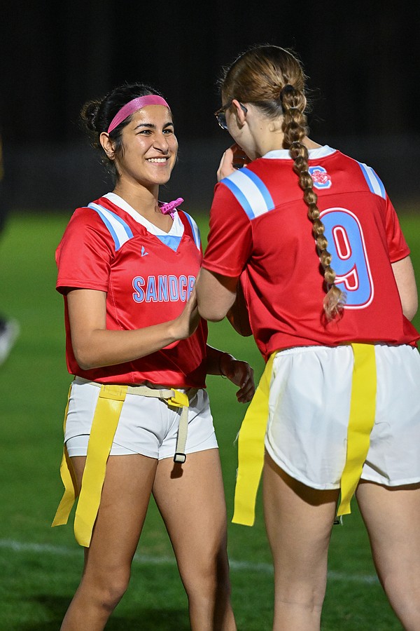 The Seabreeze flag football quarterback Rani Gupta and teammate Ava Arnold (9) put their heads together during the warmup before the game against FPC on Thursday, Feb. 19 at the Ormond Beach Sports Complex. Photo by Michele Meyers