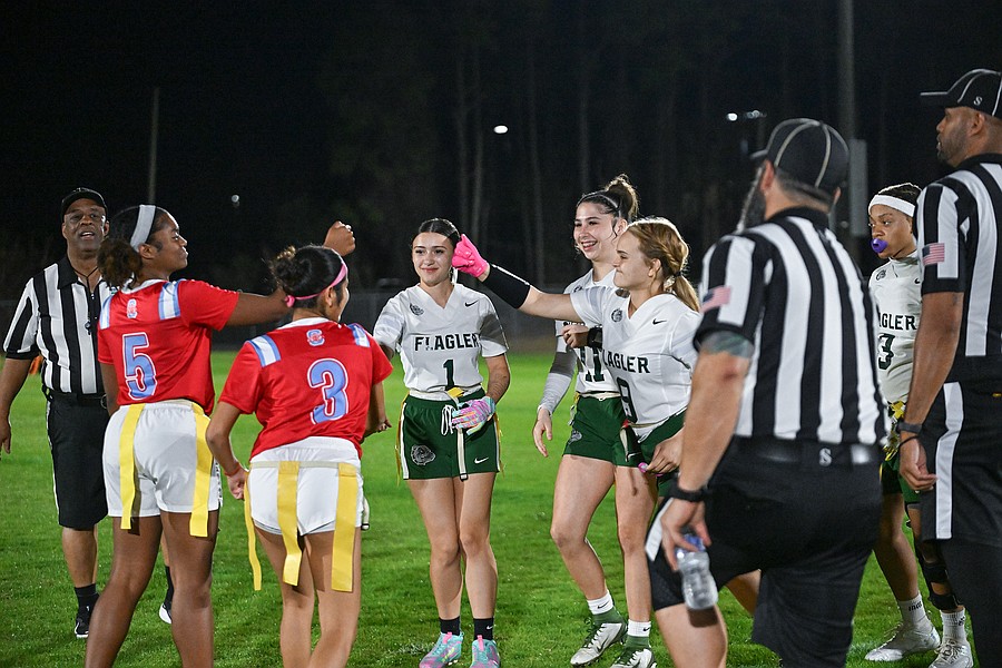 FPC flag football players (left to right) Shelby Brown, Nereyda Campos, Tori Spann and Makayla Barbel meet Seabreeze players Rani Gupta (3) and Amira Ferguson (5) for the coin toss before the game at the Ormond Beach Sports Complex on Thursday, Feb. 19. Photo by Michele Meyers