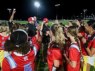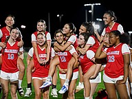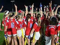 Seabreeze celebrates with head flag football coach Zeke Adkins (center) in the win over FPC on Thursday, Feb. 19 at the Ormond Beach Sports Complex. Photo by Michele Meyers