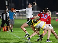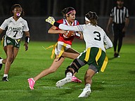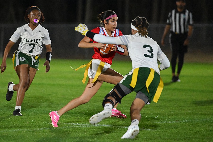 The FPC flag football quarterback Nereyda Campos charges through Seabreeze defenders on Thursday, Feb. 19 at the Ormond Beach Sports Complex. Photo by Michele Meyers