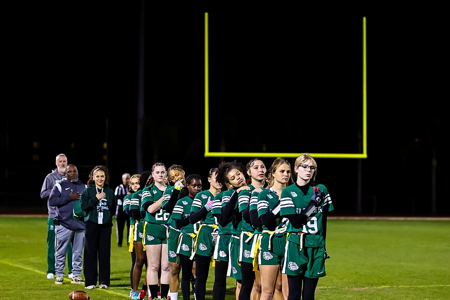The Bulldogs line up for the national anthem before their flag football game against Palatka. Photo by Keishia McLendon