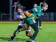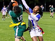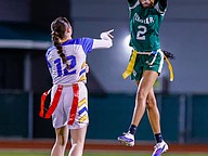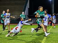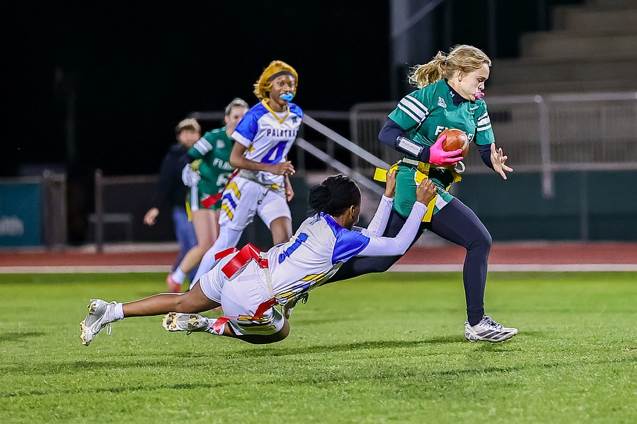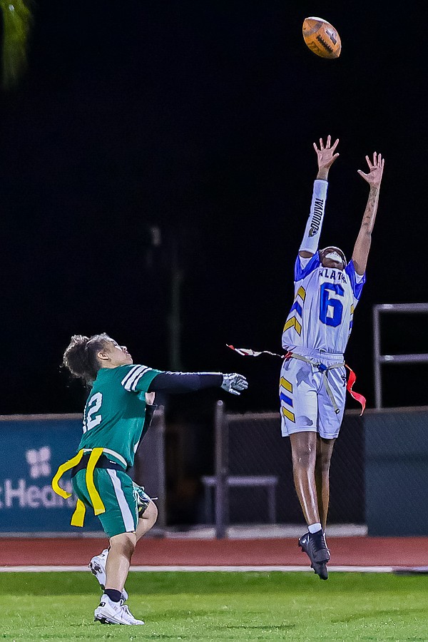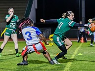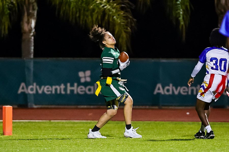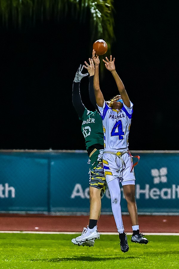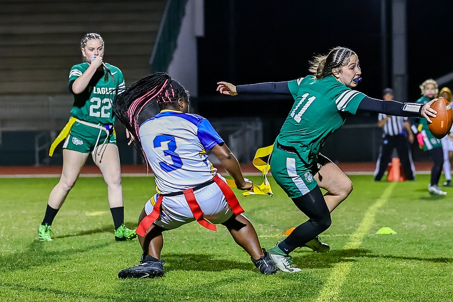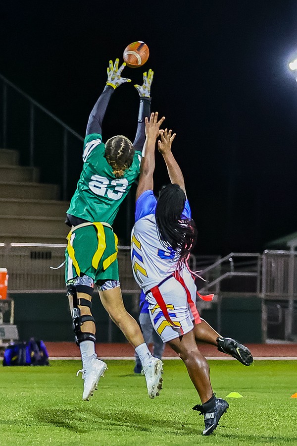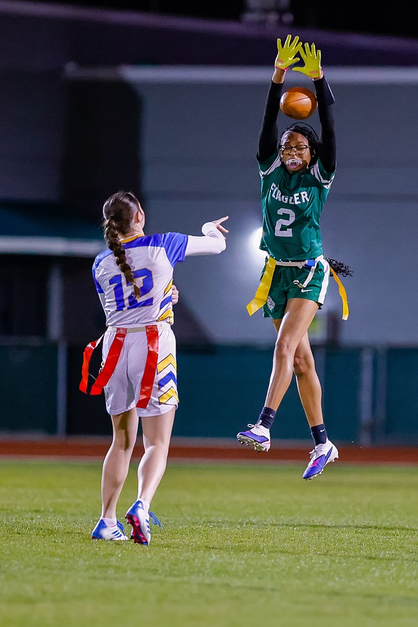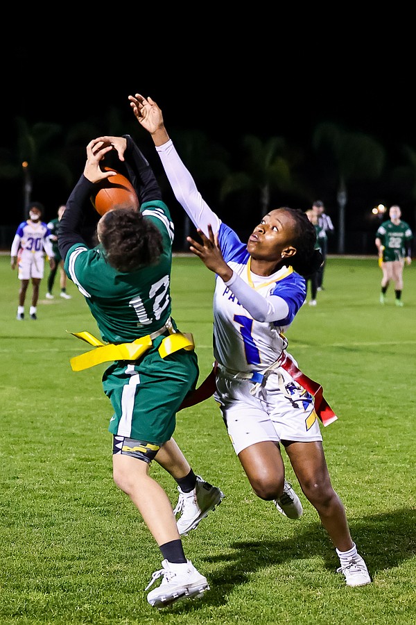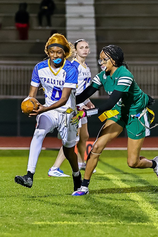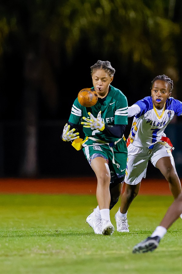 Stephanie Turner is ready to pull a flag as Palatka's Treasure McGee goes up for a pass. Photo by Keishia McLendon