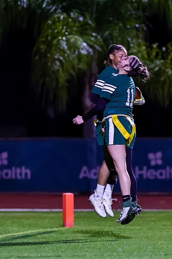 Nereyda Campos (left) congratulates Tori Spann after she scored a touchdown. Photo by Keishia McLendon