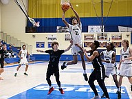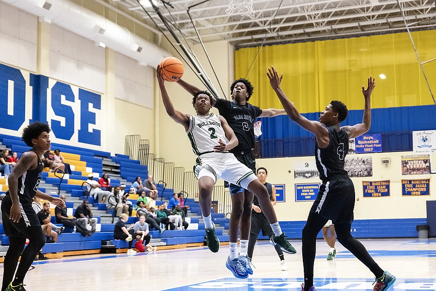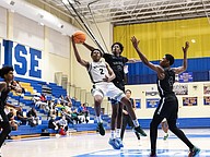 FPC's Nate Perry (2) goes up for the basket in the middle of Winter Haven's Ronquelle Metelus (2), Tyler Thelus (0) and Na'Qualen Gunter (4) at the Vince Carter Hall of Fame Classic on Monday, Dec. 29. Photo by Michele Meyers