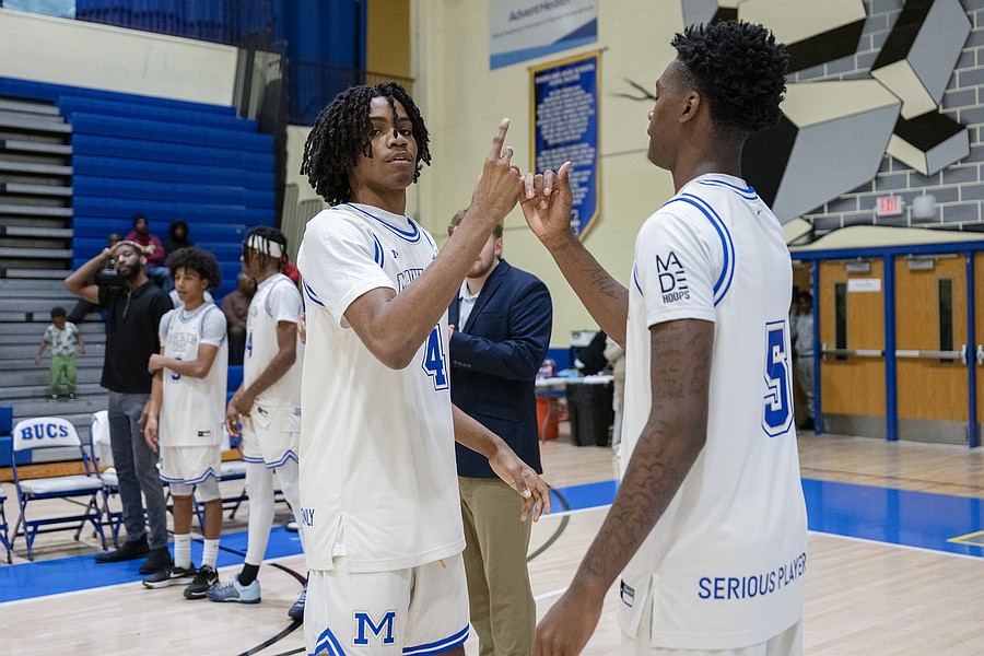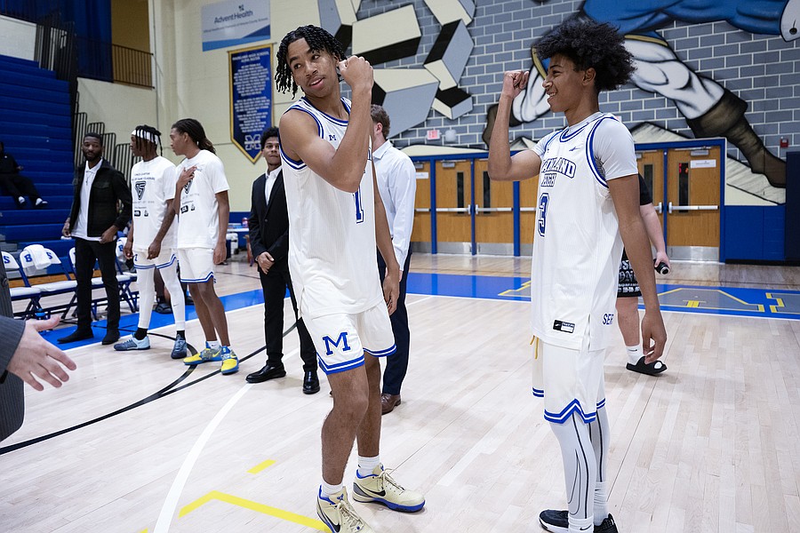 Mainland captain Beegie Gordon (1) and Michael Ortiz (3) do a player introduction routine before playing their first game at the Vince Carter Hall of Fame Classic on Monday, Dec. 29. Photo by Michele Meyers