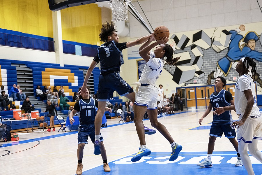 Dr. Joaquin Garcia's Diego Sanchez (5) blocks Mainland's Canyon Powers' (center) shot at the Vince Carter Hall of Fame Classic on Monday, Dec. 29. Photo by Michele Meyers