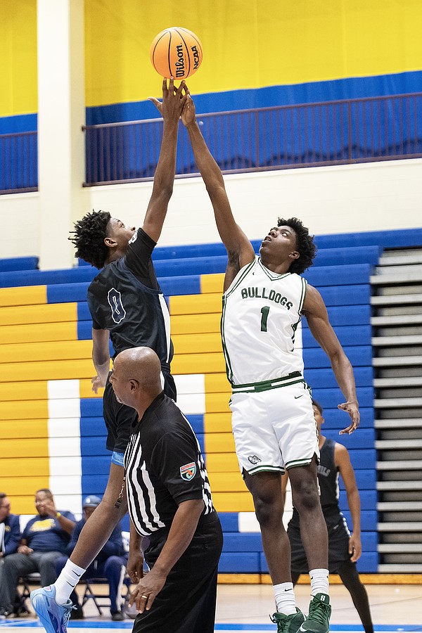 FPC's Siah Sanders (1) and Winter Haven's Tyler Thelus (0) fight for the tip off at the Vince Carter Hall of Fame Classic on Monday, Dec. 29. Photo by Michele Meyers