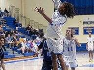 Mainland's Canyon Powers (center) fights to make a basket against Evans at the Vince Carter Hall of Fame Classic on Tuesday, Dec. 30. Photo by Michele Meyers