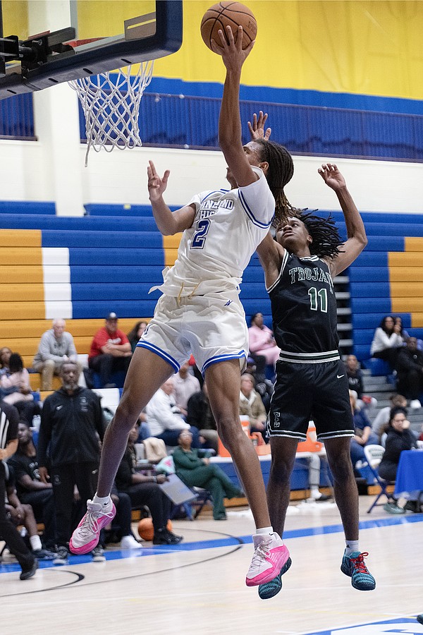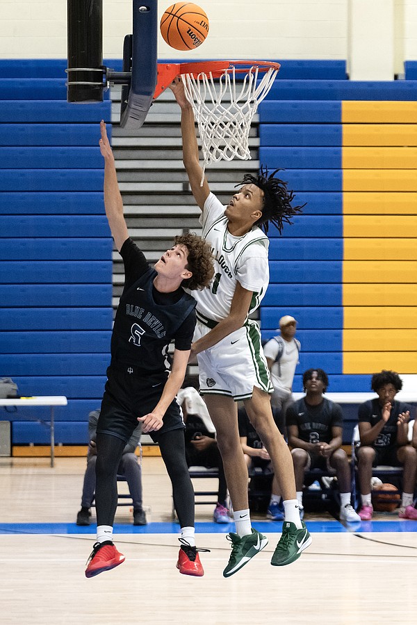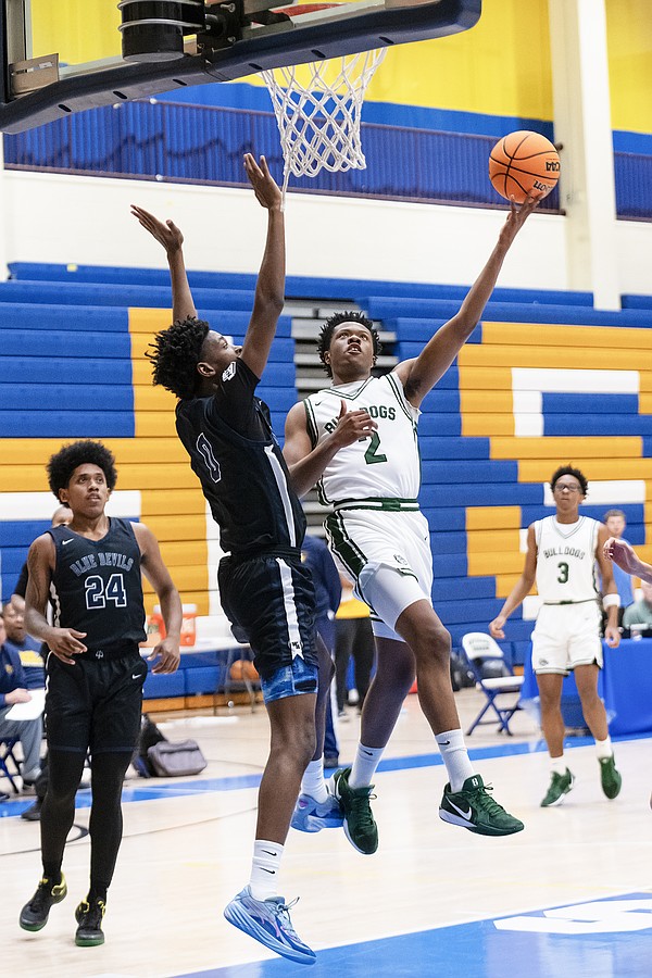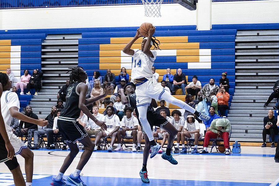 Mainland's Canyon Powers (2) flies to the hoop against Evans' guard Amari Hayslip (11) at the Vince Carter Hall of Fame Classic on Tuesday, Dec. 30. Photo by Michele Meyers