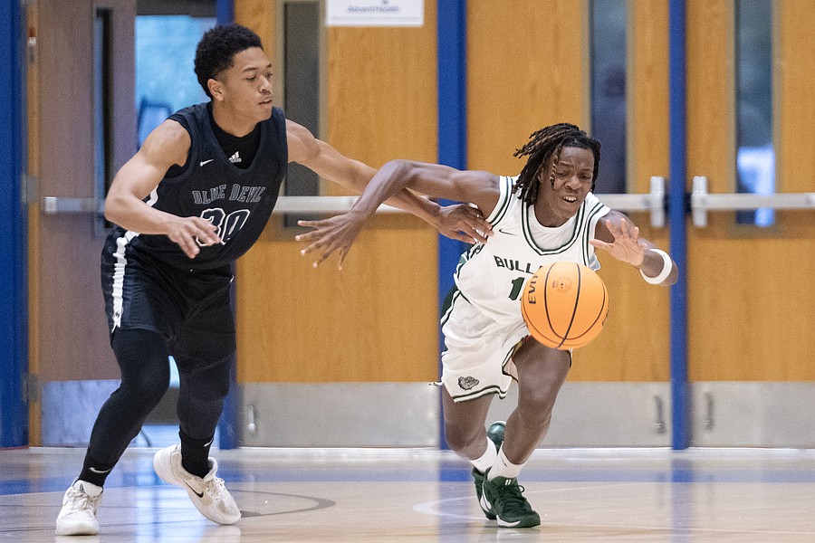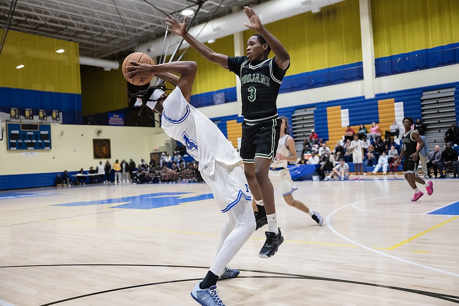 Evans' Jedd Maurvais (3) challenges Mainland's Jaheem Curry (left) during the last game of the Vince Carter Hall of Fame Classic on Tuesday, Dec. 30. Photo by Michele Meyers