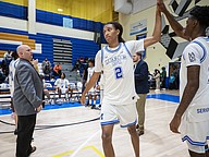 Mainland coach Joe Giddens (left) congratulates Kade Manley after he scores 1,000 points with a three-pointer in the second quarter of the game against Dr. Joaquin Garcia High School on Monday, Dec. 29. Photo by Michele Meyers