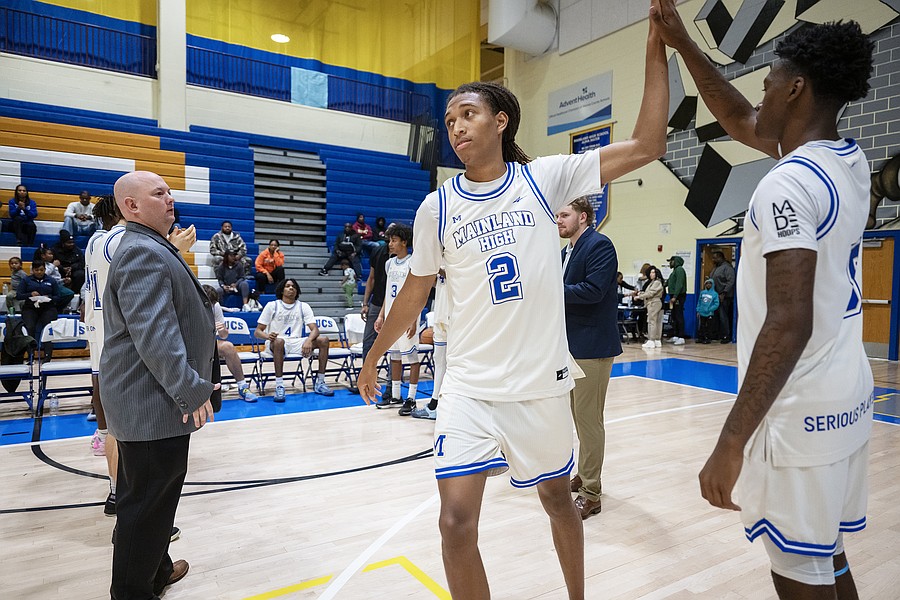 Mainland's Canyon Powers (2) high fives Jaden Parks as he is introduced before the game against Evans at the Vince Carter Hall of Fame Classic on Tuesday, Dec. 30. Photo by Michele Meyers