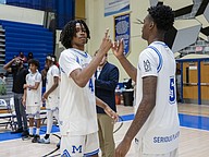 Mainland's Davon Jones (4) runs through his player intro routine with Jaden Parks before the game against Evans at the Vince Carter Hall of Fame Classic on Tuesday, Dec. 30. Photo by Michele Meyers