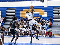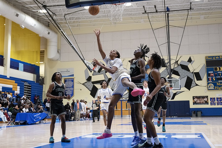 FPC's Desmond Goodwin (center) drives to the basket against Winter Haven at the Vince Carter Hall of Fame Classic on Monday, Dec. 29. Photo by Michele Meyers