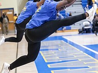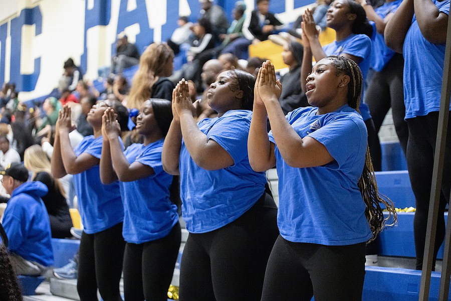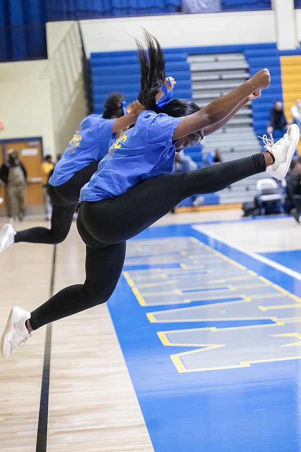 Rebound by Mainland cheerleaders motivate the crowd during the game against Evans at the Vince Carter Hall of Fame Classic on Tuesday, Dec. 30. Photo by Michele Meyers