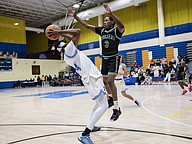 FPC's Desmond Goodwin (right) scores against Winter Haven's Jordan Hanrahan (left) for the ball at the Vince Carter Hall of Fame Classic on Monday, Dec. 29. Photo by Michele Meyers