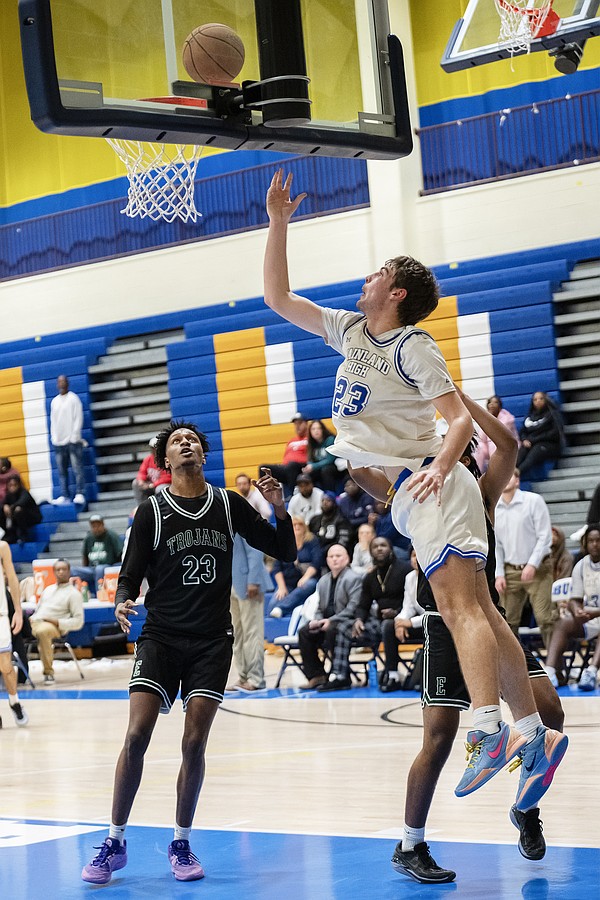 Mainland's Reece Casto (right) makes another bank shot against Evans at the Vince Carter Hall of Fame Classic on Tuesday, Dec. 30. Photo by Michele Meyers