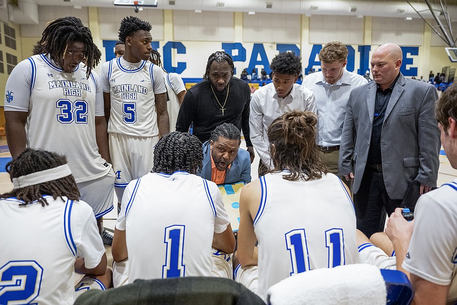 Mainland head coach Joe Giddens runs through plays during a timeout in the game against Evans at the Vince Carter Hall of Fame Classic on Tuesday, Dec. 30. Photo by Michele Meyers