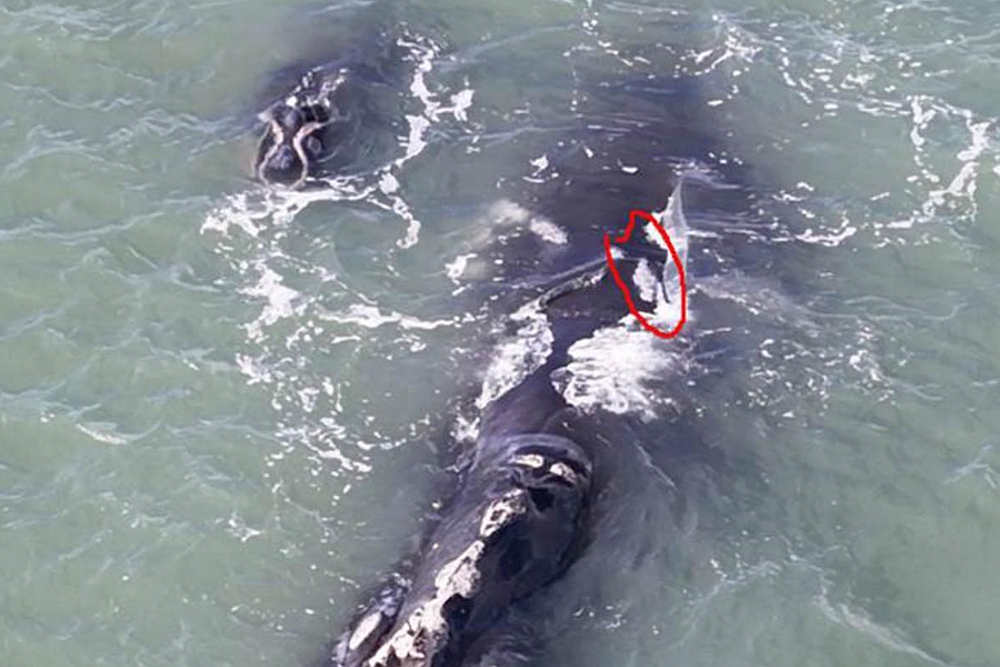 A Northern Right Whale and calf spotted in The Hammock. The red circle indicates a parch of callosities that identify this as the female "Callosity Black." Courtesy of the Marineland Right Whale Project