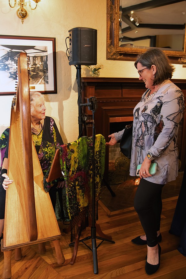 Harpist De Luna chats with Maggies Evans, of Ormond Beach, during The Casements’ Starry Starry Night event. Photo by Suzanne McCarthy