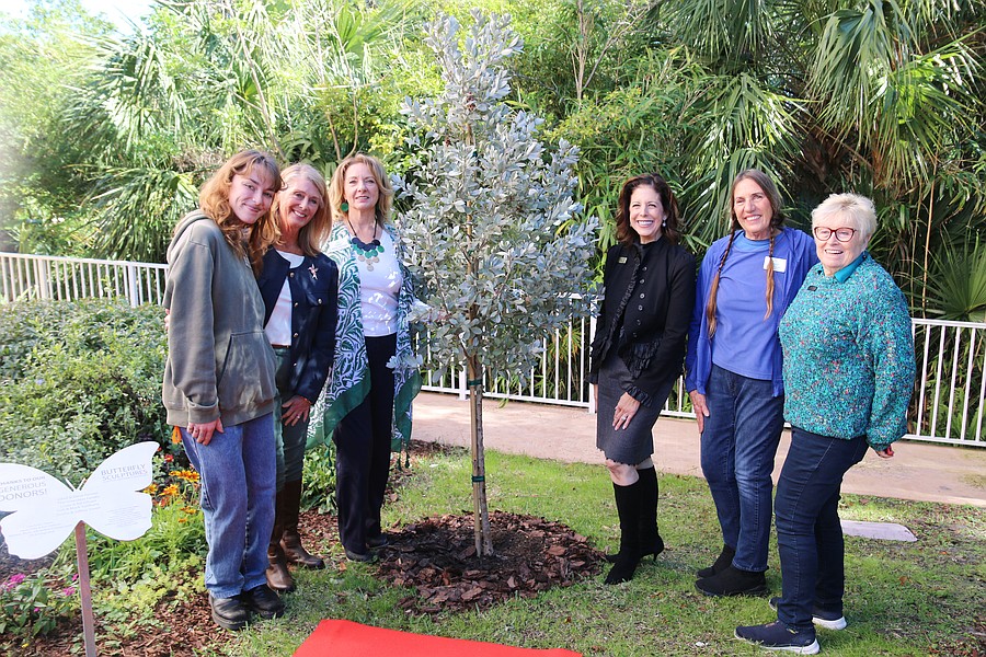 Garden apprentice Sarahbeth Mitchener, Ormond Beach Deputy Mayor Lori Tolland, OMAM Executive Director Stephanie Mason-Teague, Cherry Laurel Club President Amy Valcik, Garden Artisan Janett Taylor and Terri Malia, past president of the Cherry Laurel Garden Club and Council of Garden Clubs vice president, pose with the newly planted silver buttonwood tree. Photo by Jarleene Almenas
