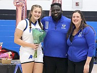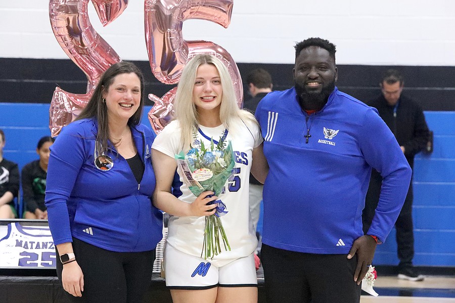 Matanzas girls basketball seniors Ruby Fogel, Kaylina Vitt and Katelyn Smith were recogninzed on Senior Night. Photo by Brent Woronoff