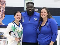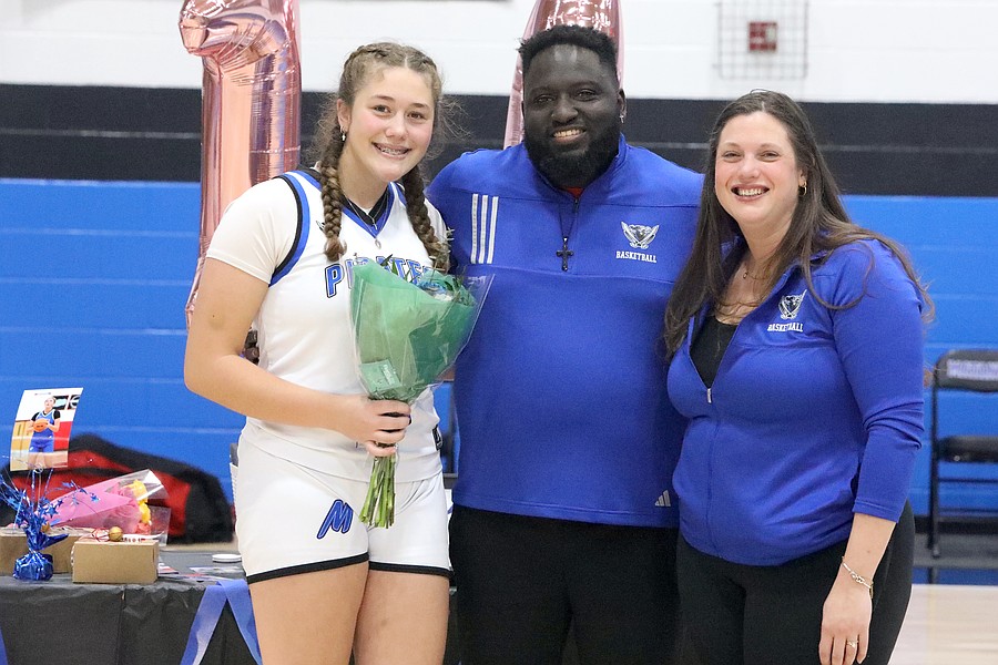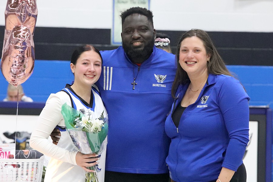 Matanzas senior Kaylina Vitt with head girls basketball coach Cory Curtis and assistant Jennifer Jorden. Photo by Brent Woronoff