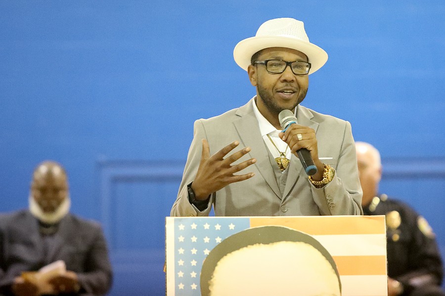 Dr. Mark Anderson, chairman of the MLK Dream Keepers, speaks at the Martin Luther King Jr. ceremony at the Carver Community Center before the parade. Photo by Brent Woronoff