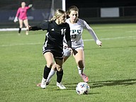 Matanzas' Chloe Harp and FPC's Laura Hererra battle for the ball. Photo by Brent Woronoff