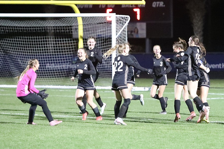 Matanzas goalkeeper Ella Forbes (left) runs up to celebrate Emma Skinner's game-tying goal with her teammates. Photo by Brent Woronoff