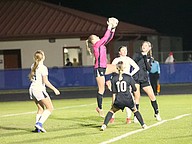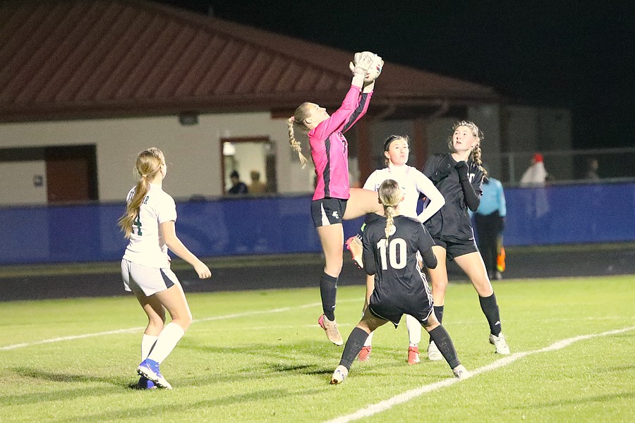 FPC goalkeeper Natalie leaps up to make a save. Photo by Brent Woronoff