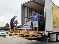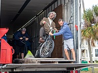 Ormond Beach resident Lauri Jackson reacts to "Keep Life in Balance" during delivery for Art Imitates Life II – Beyond the Bronze. Photo by Suzanne McCarthy