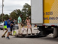 "Sweet Sixteen" and "Hot Weather" by Seward Johnson, are transported during installation of Art Imitates Life II – Beyond the Bronze in Ormond Beach. Photo by Suzanne McCarthy