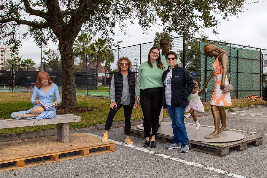 Judy Stein, vice president of the Ormond Beach Arts District; Sara Dionne, The Casements Cultural Center coordinator; and Julia Truilo, president of the Arts District, view Seward Johnson sculptures after they are delivered to The Casements for Art Imitates Life II – Beyond the Bronze in Ormond Beach. Photo by Suzanne McCarthy