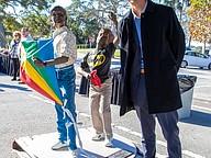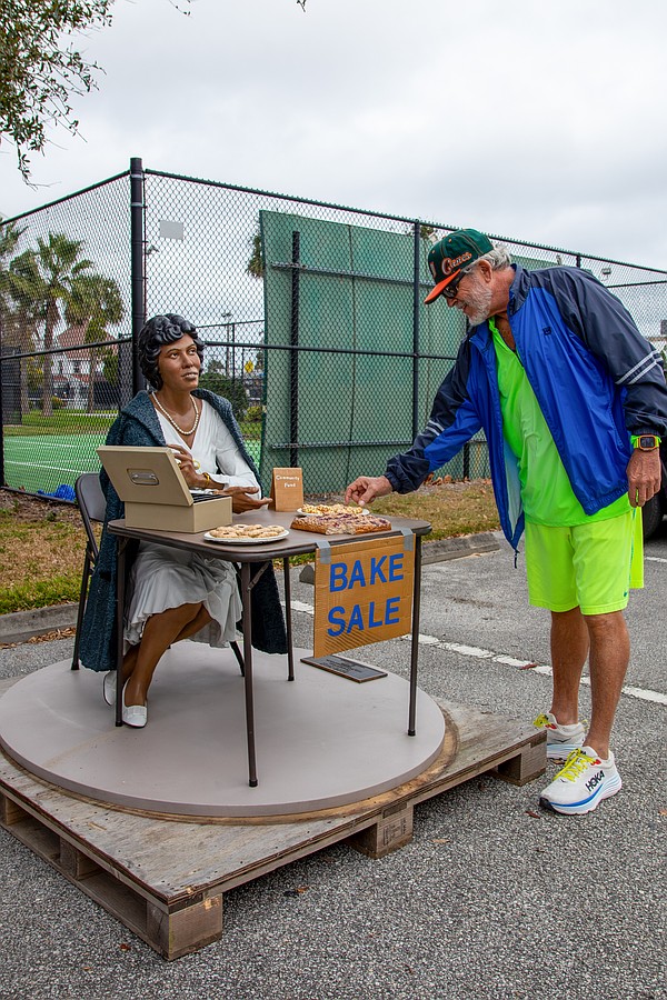 Ormond-by-the-Sea resident Bud De Jacomo views "Bake Sale," a sculpture by Seward Johnson, as it arrives for Art Imitates Life II – Beyond the Bronze in Ormond Beach. Photo by Suzanne McCarthy