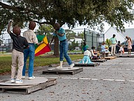 "A Reason to Smile" and "Keep Life in Balance," sculptures by Seward Johnson, are staged during installation for Art Imitates Life II – Beyond the Bronze in Ormond Beach. Photo by Suzanne McCarthy