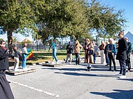 Julia Truilo, president of the Ormond Beach Arts District, speaks with Ormond Beach residents Michael and Ginger as Seward Johnson sculptures arrive for Art Imitates Life II – Beyond the Bronze in Ormond Beach. Photo by Suzanne McCarthy