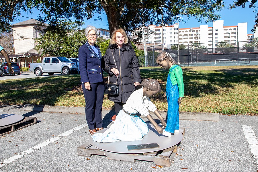 Linda Neubauer and Anne Lichtigman pose with "Big Sister," a Seward Johnson sculpture sponsored by the Lichtigman and Neubauer families, during a sponsor reception for Art Imitates Life II – Beyond the Bronze at The Casements on Friday, Jan. 16. Photo by Suzanne McCarthy