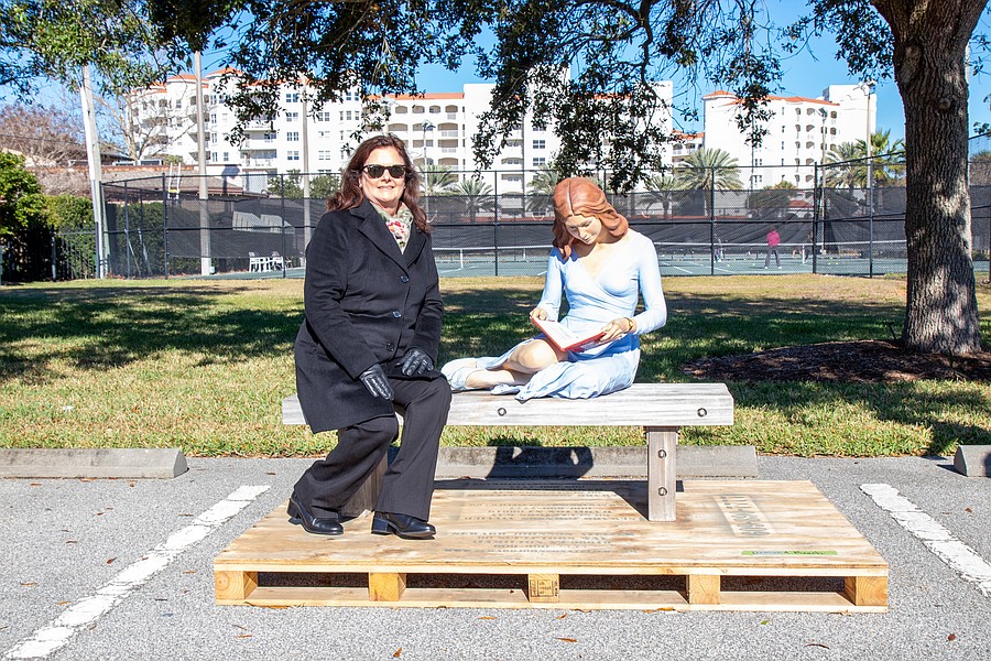 Nancy Suah, treasurer of the Ormond Memorial Art Museum board of directors, poses with "Sweet Sixteen," a Seward Johnson sculpture sponsored by the museum, during a sponsor reception for Art Imitates Life II – Beyond the Bronze at The Casements on Friday, Jan. 16. Photo by Suzanne McCarthy
