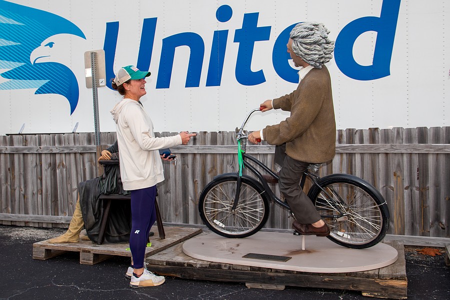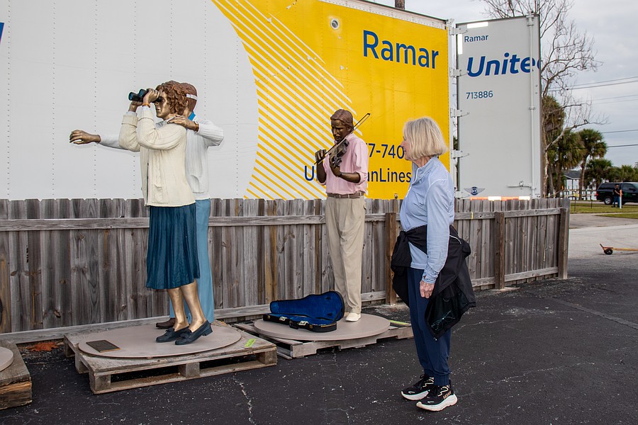 Ormond Beach resident Betsy Halliday views Seward Johnson sculptures as they arrive for Art Imitates Life II – Beyond the Bronze in Ormond Beach. Photo by Suzanne McCarthy