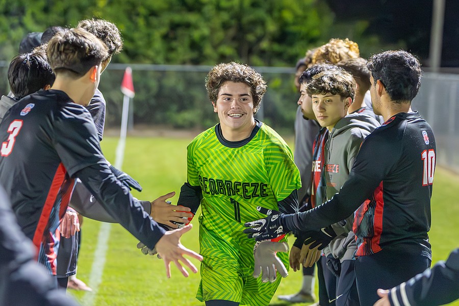 Goalkeeper Chandler Klepper (1) high-fives his Seabreeze teammates during the team tunnel before the game. Photo by Sydney Tevin
