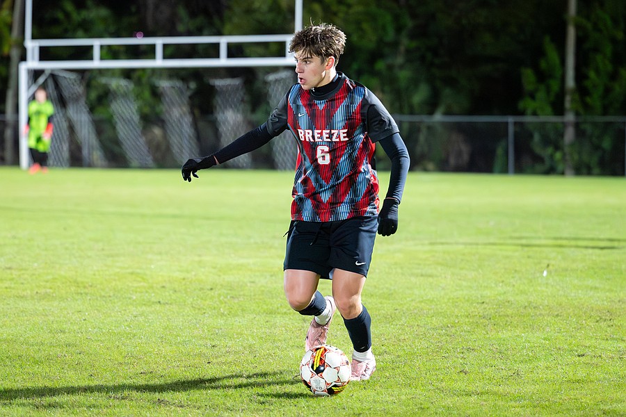 Seabreeze's Luke Harrell keeps his eye out for opposing players. The senior captain scored with six minutes remaining to force a 1-1 tie with University. Photo by Sydney Tevin