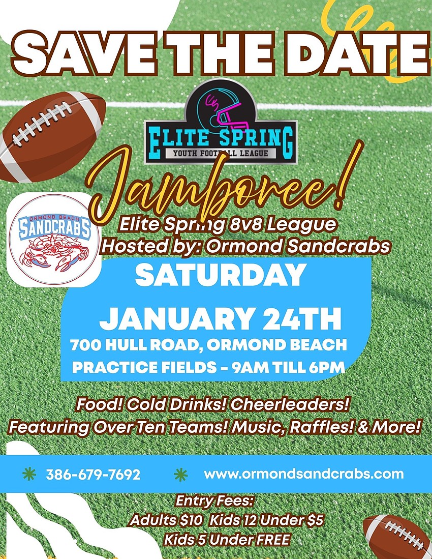 The Ormond Sandcrabs are hosting the Elite Spring 8v8 Football Jamboree on Saturday, Jan. 24, at the Ormond Beach Sports Comples, 700 Hull Road.