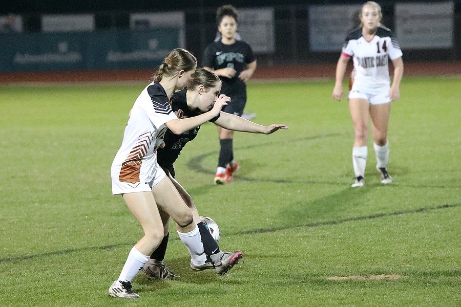 Isabella Kummernes (right) and Atlantic Coast's Ella Marjenhoff try to gain possession. Photo by Brent Woronoff