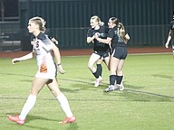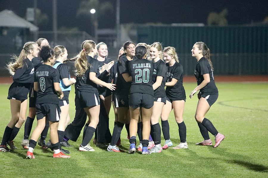 Flagler Palm Coast's girls soccr players celebrate after defeating Atlantic Coast 1-0 in the District 1-7A semifinal on Jan. 22. Photo by Brent Woronoff