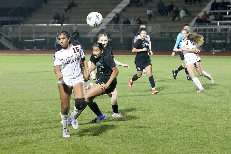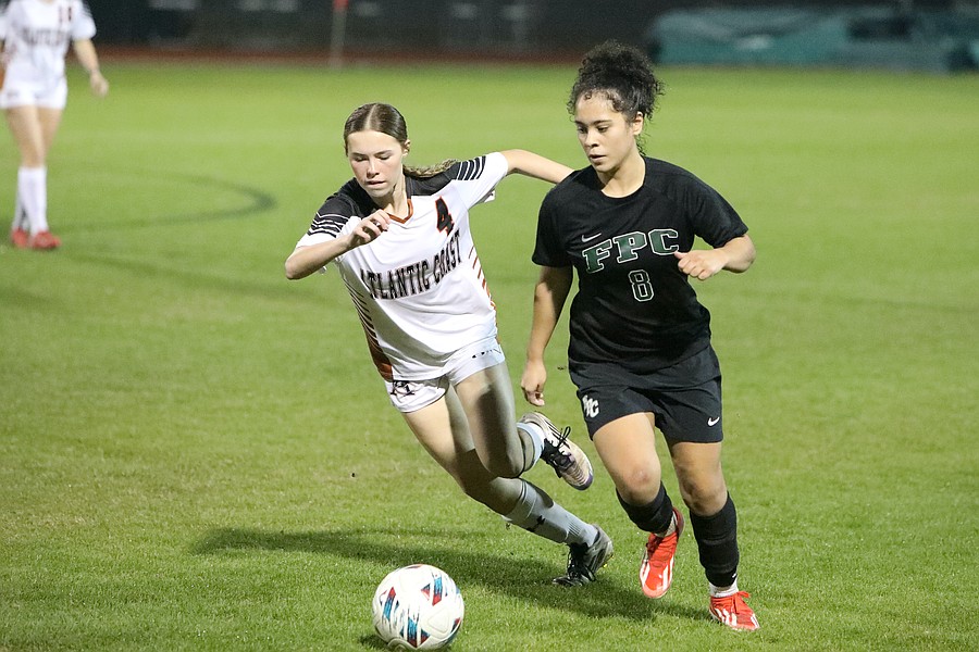 FPC's Hailey Sammons (right) goes after the ball with Atlantic Coast's Abby Miller. Photo by Brent Woronoff