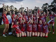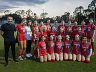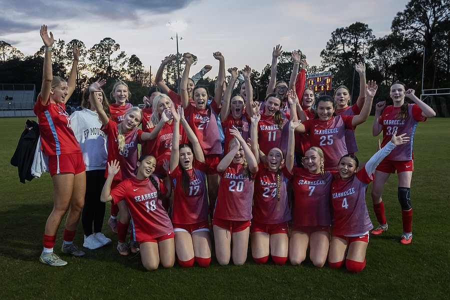 The Seabreeze girls soccer team celebrates their District 6-5A semifinal win against Pine Ridge on Thursday, Jan. 22 at the Ormond Beach Sports Complex. Photo by Michele Meyers