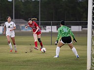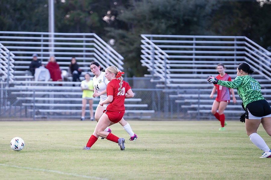 Pine Ridge goalkeeper Jazleen Sanchez (right) runs out of the goal as Seabreeze's Madison Opalewski (20) kicks a goal during the District 6-5A semifinal on Thursday, Jan. 22 at the Ormond Beach Sports Complex. Photo by Michele Meyers